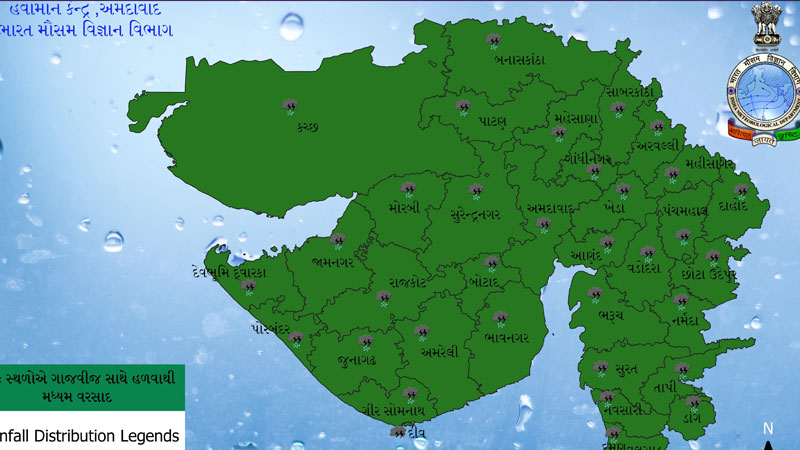 હવામાન વિભાગ દ્વારા આજે રાજ્યનાં કચ્છ, સૌરાષ્ટ્ર, ઉત્તર ગુજરાત તેમજ મધ્ય ગુજરાતમાં હવામાન વિભાગ દ્વારા વરસાદની આગાહી કરી છે.હવામાન વિભાગ દ્વારા રાજ્યમાં સોમવારે ઉત્તર ગુજરાત, મધ્ય ગુજરાત, સૌરાષ્ટ્ર તેમજ કચ્છ જીલ્લામાં ગાજવીજ સાથે વરસાદ પડવાની આગાહી કરી છે.નવસારી સહિત સમગ્ર દક્ષિણ ગુજરાતના જિલ્લાઓમાં મેઘ મહેર જામી છે. જેમાં નવસારી જિલ્લાની પૂર્ણા, અંબિકા, કાવેરી, ખરેરા, મીંઢોળા નદીઓમાં નવા નીર આવ્યા છે. કાવેરી નદીની જળ સપાટી 12 ફૂટ સુધી પહોંચી છે. જલાલપોર તાલુકાના ખરસાડ ગામ વરસાદના કારણે જળબંબાકાર થઈ ગયું હતું. સમગ્ર ગામ પાણીમાં ગરકાવ થઈ ગયું હતું.વલસાડ જિલ્લામાં સતત વરસાદ વરસી રહ્યો છે. વલસાડ તાલુકામાં 5.5 ઇંચ વરસાદ ખાબકતા જનજીવન અસ્તવ્યસ્ત. વલસાડ તાલુકાના લીલાપુર સ્ટેટ હાઇવે પર પાણી ભરાતા વાહનચાલકો અટવાયા.વલસાડના કેટલાક ગામોમાં ભરાયા વરસાદી પાણી ભરાઈ જવા પામ્યા હતા. ગામમાં વરસાદી પાણી ભરાતા ઘરોમાં પાણી ઘૂસ્યા હતા. મહાનગરપાલિકાની કામગીરીને લઈને લોકોમાં ભારે રોષ જોવા મળ્યો હતો. સ્થાનિકો દ્વારા આક્ષેપ કર્યા હતા કે, બિલ્ડીંગો વધુ બનવાને કારણે પાણી ભરાય છે.