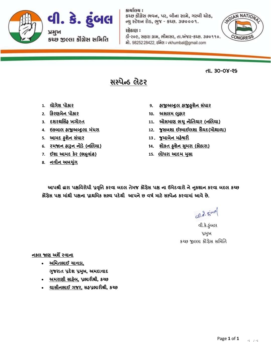 સસ્પેન્ડ કરાયેલા નામોમાં યોગેશ પોકાર, કિરણબેન પોકાર, દશરથસિંહ ખગોરત, ઇકબાલ હાજીઅબ્દુલા મંધરા, આમદ હસેન સંધાર, રમજાન હારન નોડે (નલિયા), ઈશા આમદ કેર (ભદ્રવાંઢ), નવીન અબચુંગ, હાજીઅબ્દુલ હાજીહુસેન સંધાર, અસલમ લુહાર, ઓસમાણ ભચુ નોતિયાર (નલિયા), જુસબશા ઈસ્માઈલશા સૈયદ (મોથાળા), જુમાબેન મહેશ્વરી, શોકત હસેન સુમરા (કોઠારા) અને લોધરા આદમ મુસા સામેલ છે.